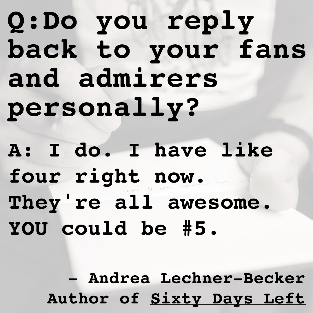Andrea's debut novel, Sixty Days Left, the diary of 30-year-old woman living with terminal cancer, is currently available for purchase as an ebook, or an actual book with ink on paper.
